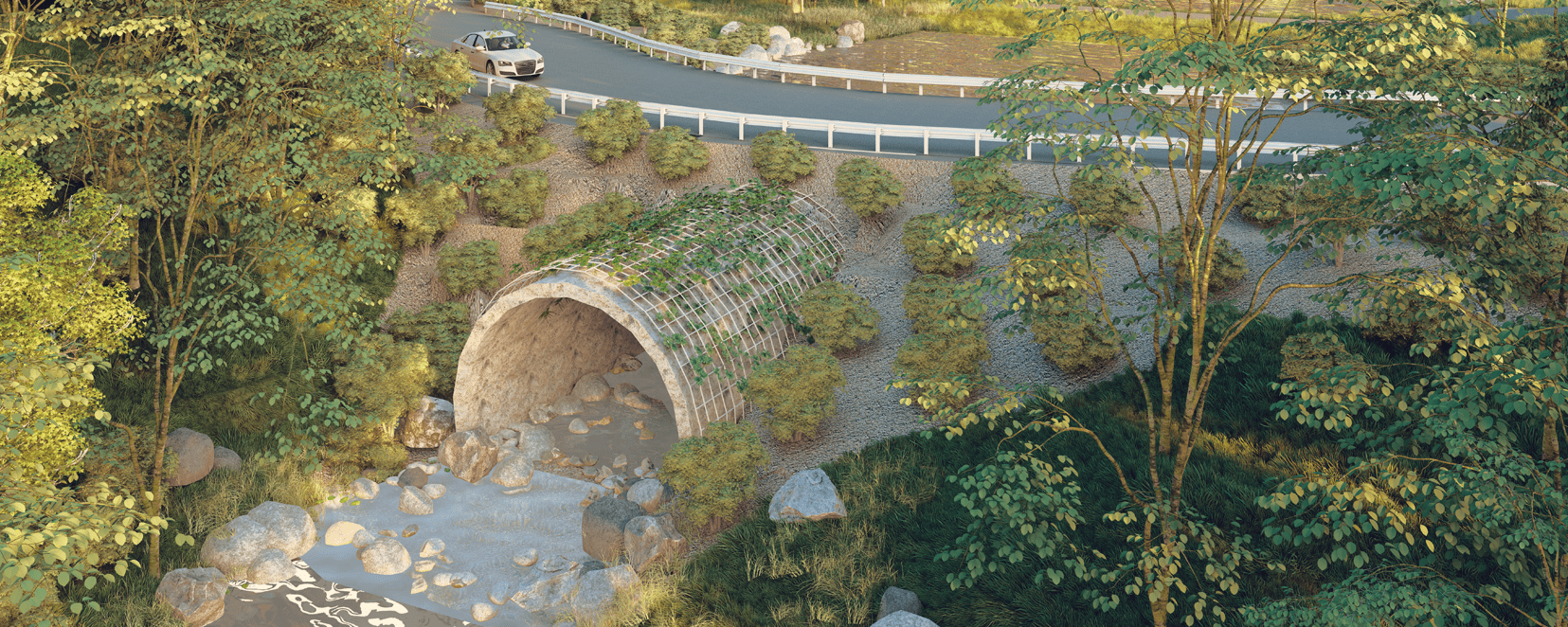 Les interventions proposées visent à intégrer l’ouvrage au paysage en s’inspirant du fonctionnement des milieux naturels. Le ponceau est ainsi aménagé comme un cours d’eau reconstitué, grâce à un empierrement colmaté qui favorise à la fois l’écoulement de l’eau et l’établissement de la végétation. Un grillage arqué végétalisé installé directement sur le ponceau permet de verdir la structure tout en assurant sa stabilité.